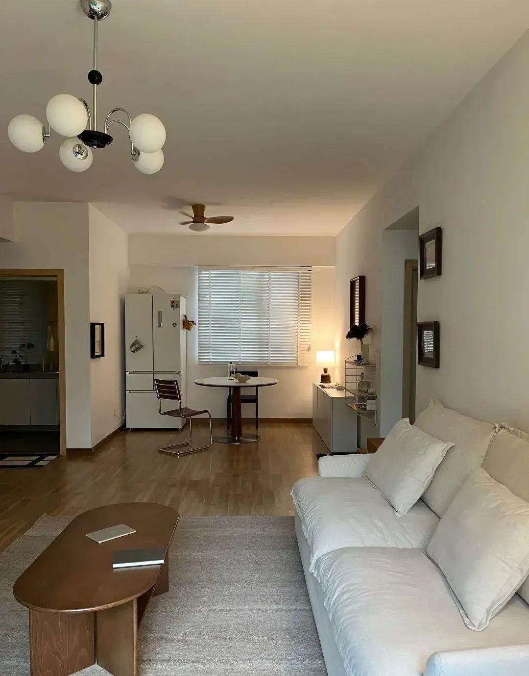 🌿 地面上铺的木地板,暖和得就像冬天里的一杯热可可。沙发区域的白色沙发,简约又不失格调。墙上那两幅极简艺术画,简直就是点睛之笔,让人忍不住多看几眼。